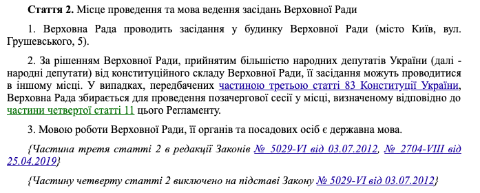 С одной стороны, вторая статья Регламента предполагает, что "языком работы Верховной Рады, ее органов и должностных лиц является государственный язык".