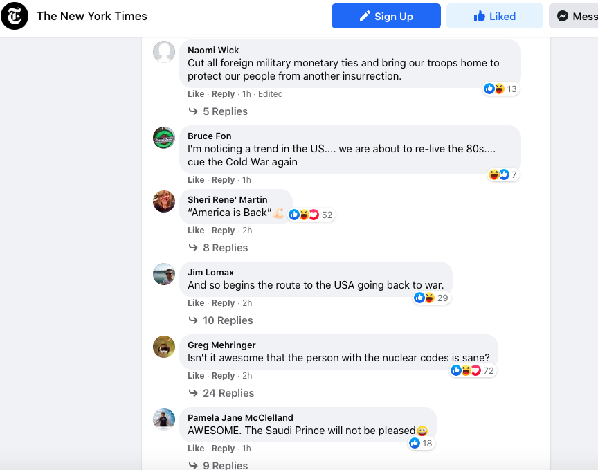 При этом немало кто критикует президента США за "вмешательство" в дела других стран и двойные стандарты (и таких комментариев много даже на страницах в соцсетях либеральных изданий вроде New York Times).