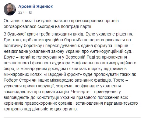 В пользу этой версии говорит заявление экс-премьера, появившееся на его странице в Фейсбуке поздно вечером. В нем говорится о готовности НФ безотлагательно проголосовать за закон об антикоррупционных судах и назначить через Раду аудитора НАБУ, причем НФ будет предлагать на ту должность Роберта Сторча "или других международно признанных специалистов".