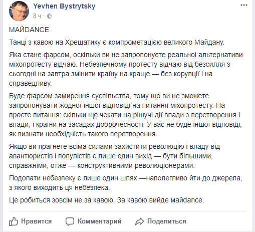 "(Эта акция) будет фарсом примирения общества, потому что вы не сможете предложить никакого другого ответа на вопрос михопротеста. На простой вопрос: сколько еще ждать решительных действий власти по преобразованию и власти, и страны на основе добродетели. У вас не будет другого ответа, кроме как признать необходимость такого преобразования. Если вы хотите всеми силами защитить революцию и власть от авантюристов и популистов, есть только один выход - быть большими, настоящими, а значит - конструктивными революционерами... Это делается вовсе не за кофе. За кофе получится майdance", - подытожил Быстрицкий.