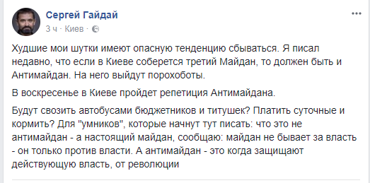 "Я писал недавно, что если в Киеве соберется третий Майдан, то должен быть и Антимайдан. На него выйдут порохоботы. Будут свозить автобусами бюджетников и титушек? Платить суточные и кормить? Для "умников", которые начнут тут писать: что это не антимайдан - а настоящий майдан, сообщаю: майдан не бывает за власть - он только против власти. А антимайдан - это когда защищают действующую власть, от революции", - считает Гайдай.