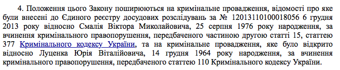 В последний месяц об этом законе многие говорили в связи с делом Ивана Бубенчика, который признался в убийствах сотрудников МВД утром 20 февраля. В процессе выяснилось, что закон этот содержит положение выписанное конкретно под Луценко. А именно - освобождает нынешнего генпрокурора от ответственности по весьма тяжелой статье - 110 УК Украины. Это так называемая "сепаратистская" статья - призывы к нарушению территориальной целостности.