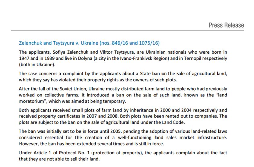 Решение принято по делу "Зеленчук и Цыцюра против Украины". ЕСПЧ признал, что мораторий на продажу земли сельскохозяйственного назначения, который много лет действует в Украине, нарушает права собственности.