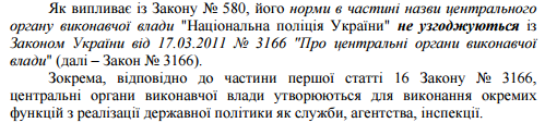 Нацполиция в профильном законе названа "центральным органом исполнительной власти". Очевидно, что ни одному из вариантов названий центральных органов власти название "Нацполиция" не соответствует:
