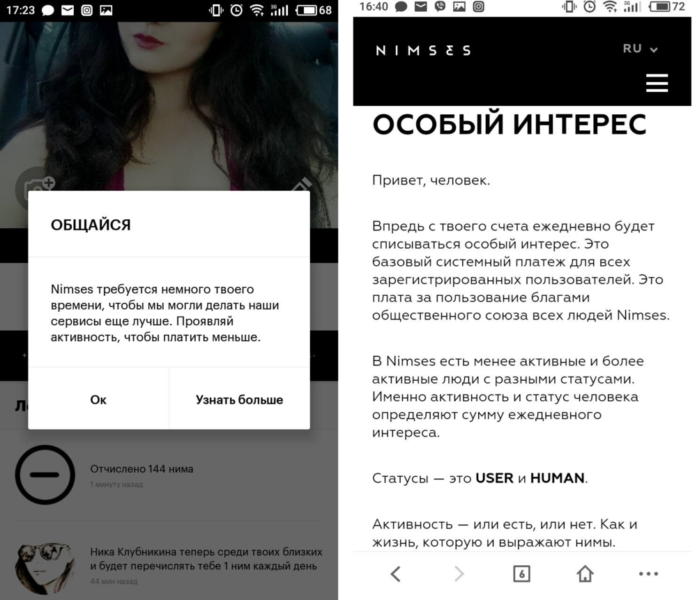 Зато начиная с 31 августа, каждый день со счета всех зарегистрированных пользователей автоматически списывают определенное количество нимов. Их сумма зависит от того, насколько человек активен в соцсети и от его статуса (Human или User). Администрация приложения называет это "особым интересом" – платой "за пользование благами общественного союза всех людей Nimses". Такой себе налог.