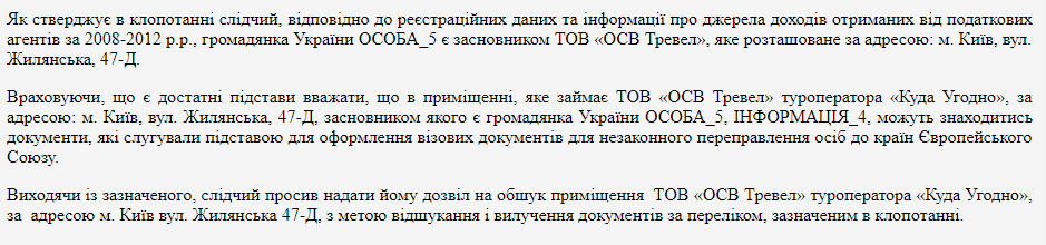 Дальше суд, со ссылкой на следователя СБУ, сообщил, что "Лицо_5" является учредителем ООО "ОСВ Тревел", расположенного по адресу: г. Киев, ул. Жилянская, 47-Д. А "ОСВ Тревел" как туроператор работает под торговой маркой "Куда угодно":