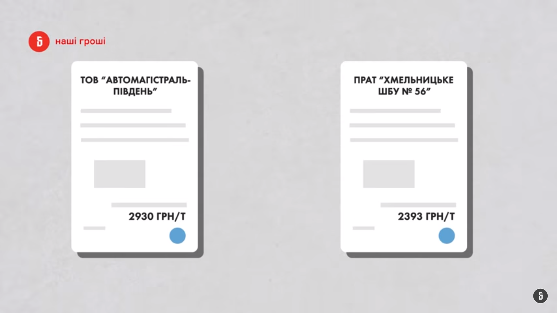 Например, в декабре 2019-го года на тендере на ремонт дороги "Киев-Сумы-Юнаковка", асфальтобетон ЩМАС-20 стоил для "Автомагистраль-Юг" 2 930 гривен за тонну (без НДС). Через месяц, в январе 2020-го, эта же смесь обошлась другому предприятию - ЗАО "Хмельницкое ДСУ 56" - в 2 393 гривен за тонну, то есть почти на 600 гривен дешевле: