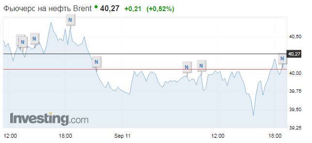 Так, в 19:24 по Киеву цена ноябрьский фьючерсов Brent на лондонской бирже ICE составляет $40,27 за баррель, что на $0,21 (0,52%) выше цены на закрытие предыдущей сессии.