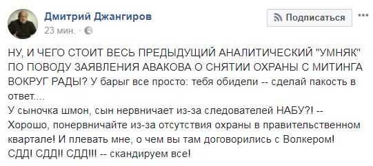 "Ну, и чего стоит весь предыдущий аналитический "умняк" по поводу заяаления Авакова о снятии охраны с митинга вокруг Рады? У барыг все просто: тебя обидели -- сделай пакость в ответ...У сыночка шмон, сын нервничает из-за следователей НАБУ?! -- Хорошо, понервничайте из-за отсутствия охраны в правительственном квартале! И плевать мне, о чем вы там договорились с Волкером!", - пишет политолог Дмитрий Джангиров в Facebook.