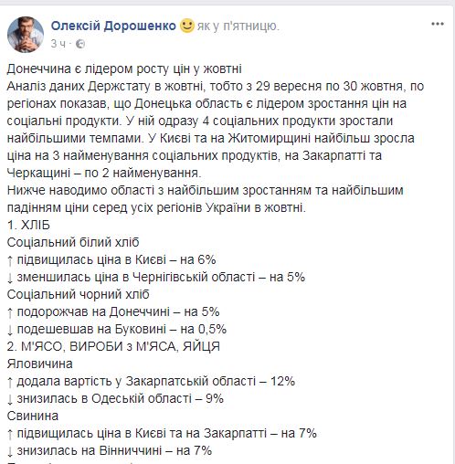 Об этом свидетельствуют данные Госкомстата в октябре, с 29 сентября по 30 октября, по регионам, которые привел председатель союза ассоциации поставщиков торговых сетей Алексей Дорошенко в социальной сети Facebook.