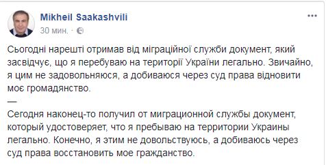 При этом Саакашвили подчеркнул, что не удовлетворится получением только этого документа, и намерен через суд добиваться восстановления его украинского гражданства.