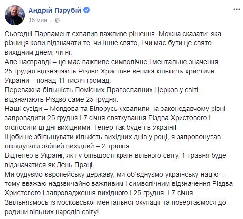 "Чтобы не увеличивать количество выходных дней в году, я предложил ликвидировать лишний выходной - 2 мая. Отныне в Украине, как и в большинстве стран свободного мира, 1 мая будет отмечаться как День Труда. Мы строим европейское государство, мы объединяем украинскую нацию - поэтому считаю чрезвычайно важным и символическим празднование Рождества Христова и введение выходного и 25 декабря, и 7 января. Освобождаемся от московской ментальной оккупации и возвращаемся к семье свободных народов мира!"