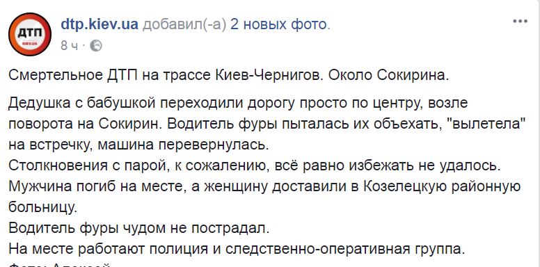Столкновения с парой, к сожалению, все равно избежать не удалось. Мужчина погиб на месте, а женщину доставили в Козелецкого районную больницу. Водитель фуры не пострадал.