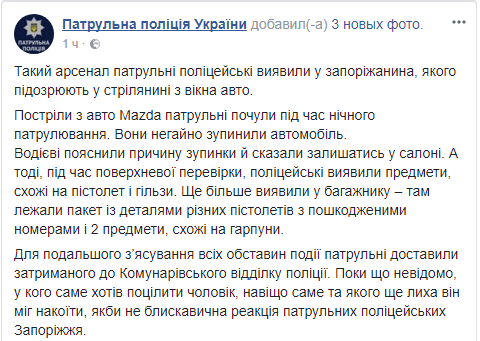 В Запорожье ночью мужчина устроил стрельбу из окна автомобиля. Об этом сообщает в Facebook местная полиция.