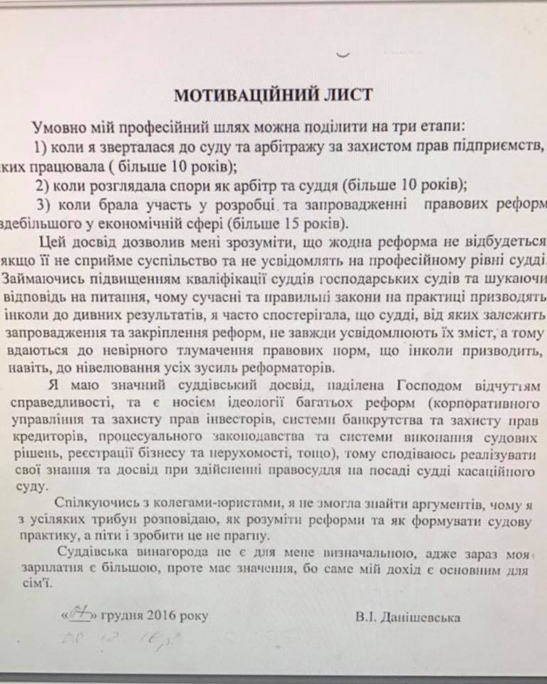 "Новый руководитель Верховного Суда наделена Господом чувством справедливости, является идеологом многих реформ, а оплату своего труда на этом посту не считает основным фактором. Не подумайте, что я сошёл с ума, я прочитал это в мотивационном письме судьи для участия в конкурсе", - написал Портнов у себя в Facebook и показал скрин автобиографии Данишевской.