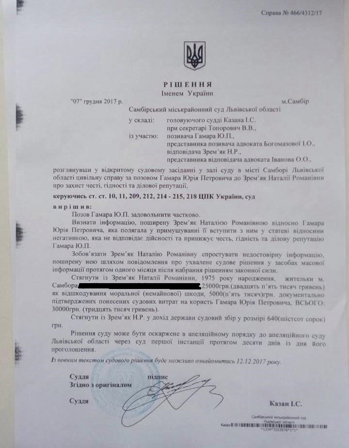 "Есть решение суда, что госпожа Зремьяк должна опровергнуть распространенную ею неправдивую информацию, что касается моей деловой репутации, достоинства. Также она должна финансово возместить моральный ущерб, юридические расходы. Речь идет о 25 тыс. грн, но я хочу, чтобы вы поняли, что дело не в средствах, а в опровержении в масс-медиа, где эта информация распространялась", – сказал Юрий Гамар.