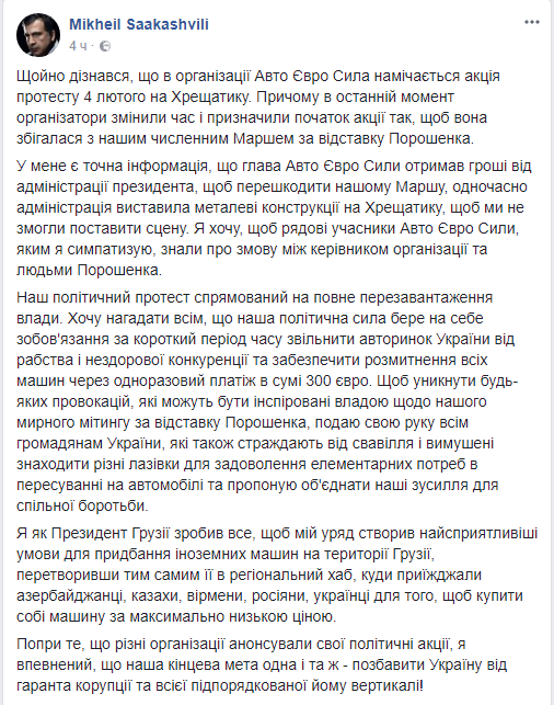 "В последний момент организаторы изменили время и назначили начало акции так, чтобы она совпадала с нашим многочисленным маршем за отставку Порошенко. У меня есть точная информация, что глава "Авто Евро Силы" получил деньги от администрации президента, для того чтобы помешать нашему маршу, одновременно администрация выставила железные конструкции на Крещатике, чтобы мы не смогли поставить сцену", - заявляет Саакашвили.