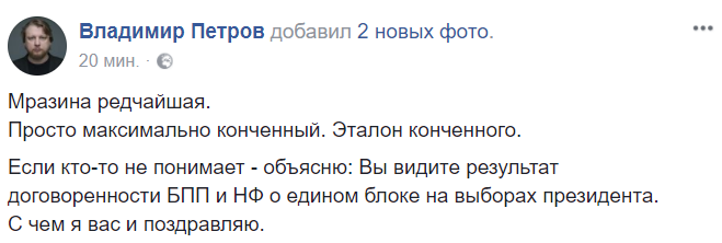 "Почему я двумя руками поддерживаю силовой разгон "михомайдана" в Киеве? Потому что собравшихся там действительно надо пи...дить. Их, и таких как они, и таких как я - очень сильно пи...дить. Чтобы, наконец, поняли - за кого мы проголосовали в 2014 году. И что люди, которые позволяют себе проливать кровь своего же народа - не имеют права называться людьми. Не то, что иметь какие-либо полномочия. Видимо, мало нас ещё били по голове, раз многие до сих пор этого не поняли", - сказал он.