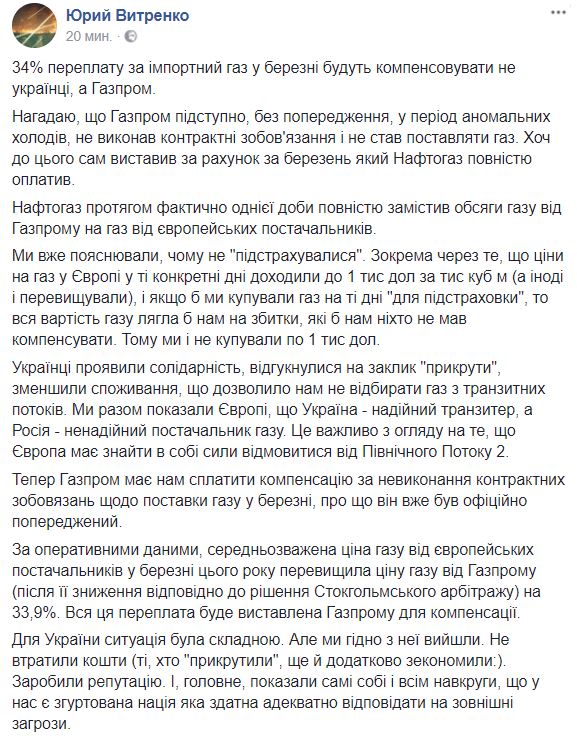 "Газпром коварно, без предупреждения, в период аномальных холодов, не выполнил контрактные обязательства и не стал поставлять газ. Хотя до этого сам выставил за счет за март который Нафтогаз полностью оплатил. Нафтогаз течение фактически одних суток полностью заместил объемы газа от Газпрома на газ от европейских поставщиков", - пишет Витренко.