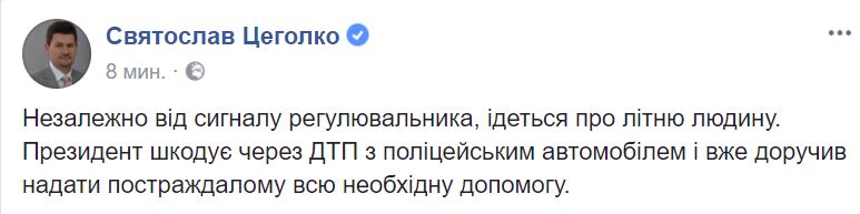 "Независимо от сигнала регулировщика, речь идет о пожилом человеке. Президент сожалеет о ДТП с полицейским автомобилем и уже поручил оказать пострадавшему всю необходимую помощь", - написал Цеголко.
