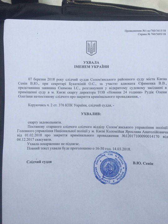 "Постановление старшего следователя отдела Соломенского управления полиции Головного управления Национальной полиции в г. Киеве Коломийца Ярослава Анатольевича от 01.02.2018 о закрытии уголовного производства №12017100090014170 от 04.12.2017 отменить. Решение обжалованию не подлежит", - говорится в решении суда.