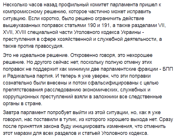 "Откровенно говоря, это нехорошее решение. Но другого сейчас нет, поскольку полную отмену этих правок не поддержит как минимум две парламентские фракции - БПП и Радикальная партия. И теперь я уже уверен, что эти правки сознательно были внесены и затем сфальсифицированы с целью препятствования расследованию экономических, служебных и коррупционных преступлений", - считает Найем.