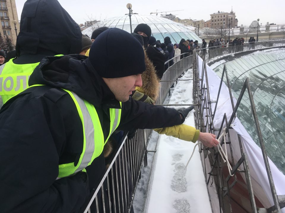 Сообщается, что плакаты провокационного и "антисаакашвилиевского" характера провисели буквально десять минут. На балкон "Глобуса" забрались сторонники РНС - среди них люди в чёрном камуфляже с надписями "Рух правых сил", и заняли эту территорию. Плакаты спустили вниз, балкон заняла сейчас полиция. Баннеры разрезают на земле ножами.