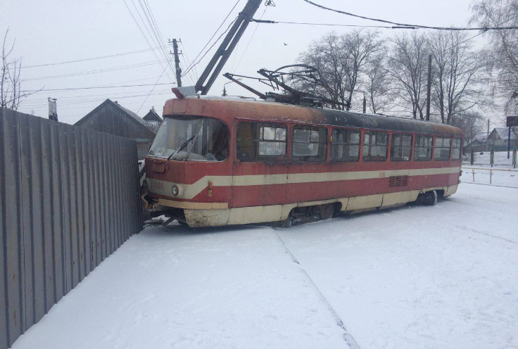 Вагон трамвая сошел с рельсов и врезался в забор частного двора. В результате столкновения был поврежден столб электросети и дорожный знак.
