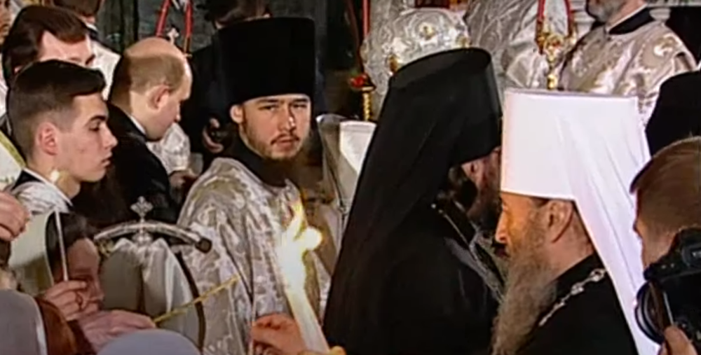 23:05 Митрополит Онуфрий внес в Трапезный храм Благодатный огонь. К нему подходят верующие и зажигают свечи. Это ежегодная традиция: митрополит сам раздает прихожанам огонь.