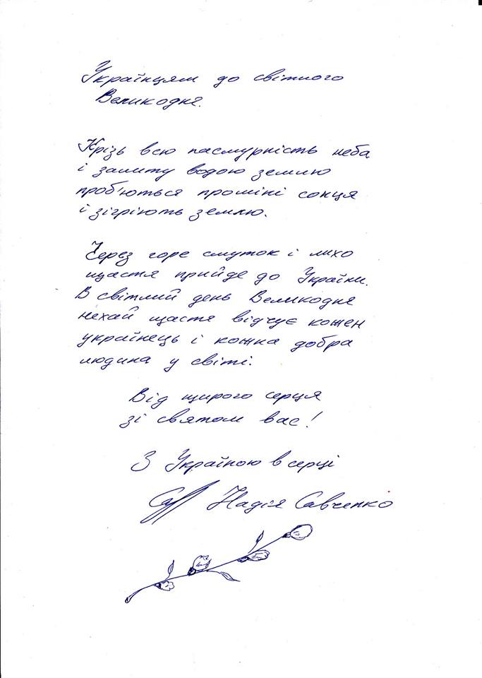 10:44 Надежда Савченко передала рукописное поздравление с Пасхой из СИЗО: