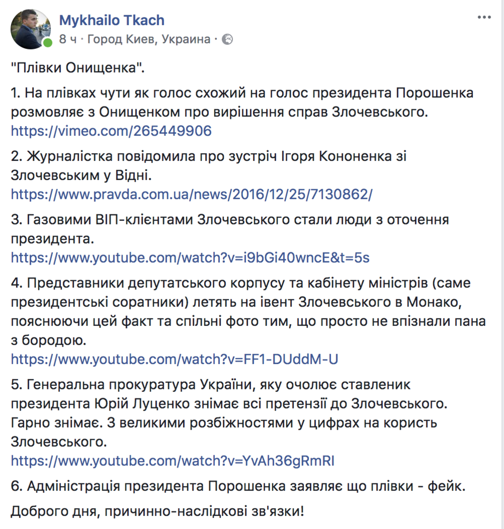 "Внимательно изучил контраргументы провластных пиарщиков по поводу скандала с пленками. "Записи" с голосом президента это фейк, говорят они. Год назад эти же люди рассказывали, что пленок вообще нет. А пленки с якобы с голосом Курченко и Саакашвили на экспертизу так никто и не отдал. Хотя все просили. Фигурант скандала, Саакашвили просил. Настаивал. А Порошенко молчит. Как и не было ничего. Я прошу. Берите пленку на экспертизу. Более того, хочу заявить, что готов предоставить НАБУ, или кто там смелый, оригинал записи для экспертизы. И устройство, что хотите. Всячески открыт к сотрудничеству по щепетильной теме", -пишет Онищенко.
