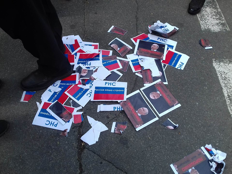 Интересно, что во время акции молодые люди раздавали листовки с надписью "РНС" на фоне российского флага и расшифровкой "Россия наша страна". С обратной стороны листовки был портрет президента РФ Владимира Путина. Как потом выяснилось, молодые люди оказались из молодежного крыла БПП. Их сторонники Саакашвили прогнали, а листовки бросили на землю.