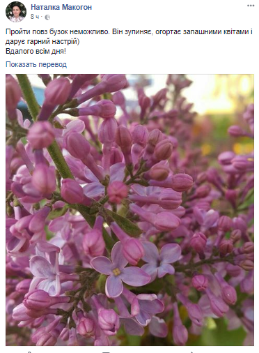 "Пройти мимо сирень невозможно. Он останавливает, окутывает душистыми цветами и дарит хорошее настроение. Удачного всем дня!"- написала в соцсети Наталья Макогон.
