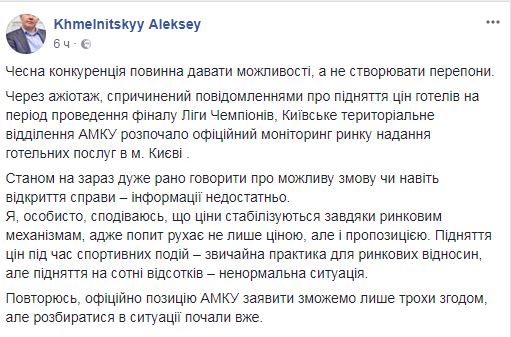 "Из-за ажиотажа, вызванного сообщениями о повышении цен отелями на период проведения финала Лиги чемпионов, Киевское территориальное отделение АМКУ начало официальный мониторинг рынка предоставления гостиничных услуг в столице", - сообщил он.