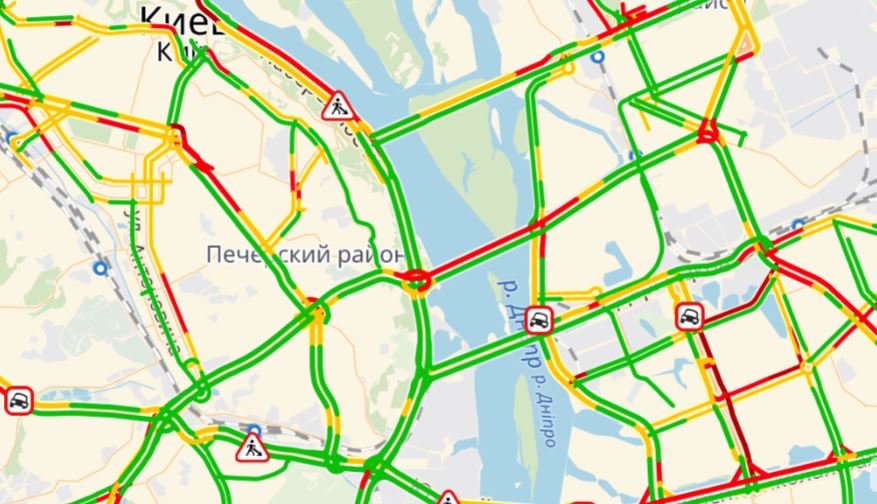 В частности, затруднено движение от метро "Житомирская" в направлении к станции метро "Святошин" по проспекту Победы. Здесь движение составляет 10 км/ч. Также местами наблюдается медленное движение на Окружной дороге в районе села Софиевская Борщаговка и на улице Пушкина.