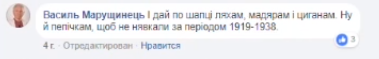 Среди прочих записей Марущинца можно увидеть такие антисемитские посты: "Ж@ды огласили войну Германии в 1934 году", "Боже, накажи ж@дов", "Бабий Яр. Не ж@дов в 1941 году, а украинцев 1918-1941 тут убито", "Ж@ды – говно".