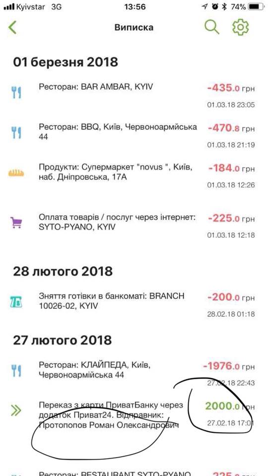 Также она опубликовала на своей странице в Facebook скрины личных переписок Ольги Миколюк с Тверским и выписки с его банковской карты.