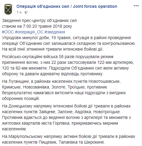 Также мы писали, что по данным штаба ООС, перед выходными число обстрелов на Донбассе уменьшилось.