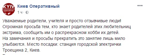 "Уважаемые родители, учителя и просто отзывчивые люди! Огромная просьба тем, кто знает родителей этих любительниц экстрима, сообщить им о распрекрасном хобби их детей. На замечания и просьбы прекратить это занятие лишь мило улыбаются. Место посадки: станция городской электрички Троещина 2, Киев. В полицию позвонила", - написала пользовательница.