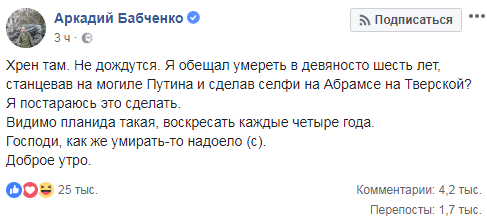 "Не дождутся. Я обещал умереть в девяносто шесть лет, станцевав на могиле Путина и сделав селфи на Абрамсе на Тверской? Я постараюсь это сделать. Видимо планида такая, воскресать каждые четыре года. Господи, как же умирать-то надоело" - написал он.