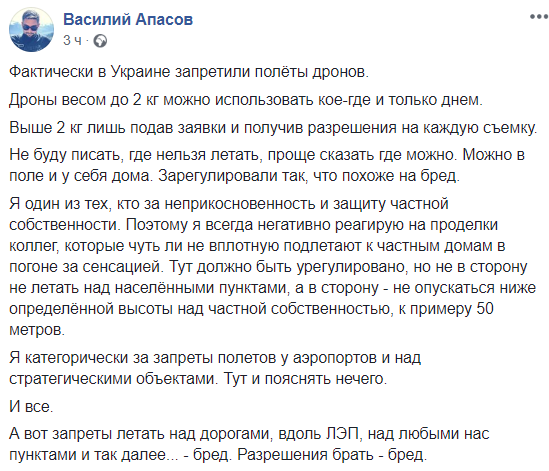 "Украина настолько прекрасна и любима! 70 тысяч рек и 40 тысяч озёр поражают своей красотой. Хочется снимать и делиться этими кадрами. Особенно, с высоты птичьего полёта. Но теперь красоту нельзя снять с квадрокоптера! Новые ограничения очень жёсткие. Почти вся территория Киева под запретом. Хорошо, что закон пока разрешает хранить дроны дома. Идиотизм, как по мне".