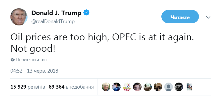 "Цены на нефть слишком высокие, ОПЕК снова взялась за свое. Нехорошо!" - написал в Twitter глава Белого дома.
