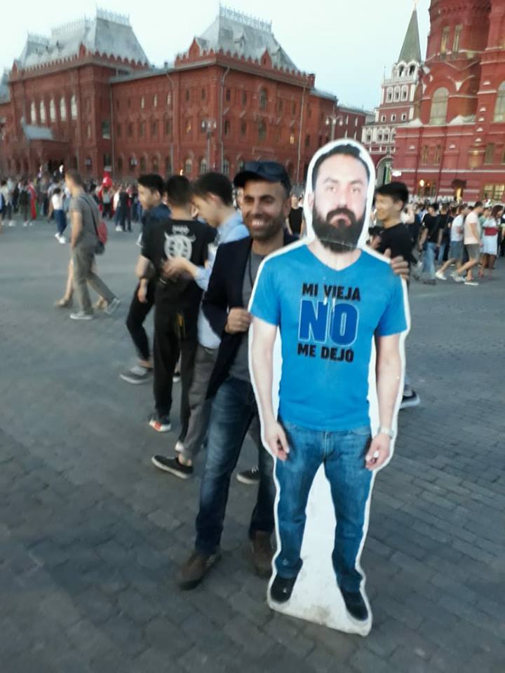 Друзья вырезали картонное изображение футбольного фаната из Мексики в футболке с надписью "Моя старуха меня не отпустила" и взяли его с собой на Мундиаль.