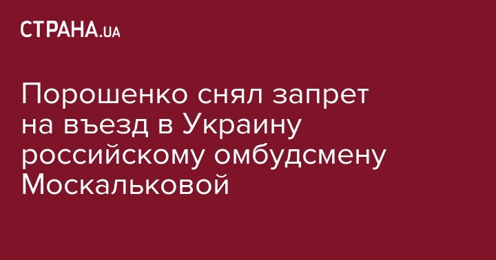 Президент Петр Порошенко снял запрет на въезд в Украину российскому омбудсмену Татьяне Москальковой, чтобы она могла посетить находящихся в Украине россиян. Визиты российского омбудсмена должны проходить параллельно с визитами украинского омбудсмена к политзаключенным Кремля, таких договоренностей ранее достигли Петр Порошенко и Владимир Путин.