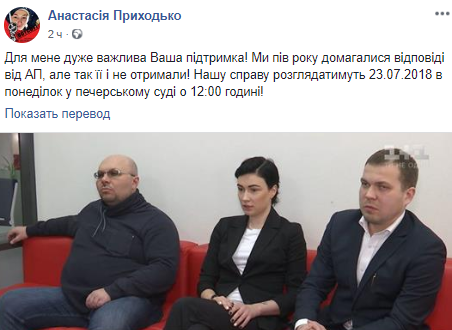 "Для меня очень важна ваша поддержка! Мы полгода добивались ответа от АП, но так его и не получили! Наше дело будут рассматривать 23.07.2018, в понедельник, в Печерском суде в 12:00!", - написала в соцсети Анастасия Приходько.