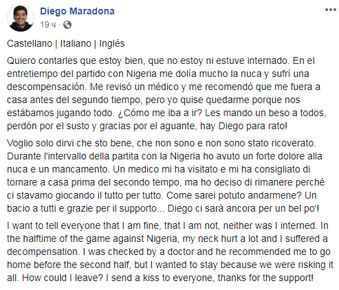 "Хочу сказать всем, что я в порядке и не был госпитализирован. Во время игры у меня сильно разболелась шея и кружилась голова. В перерыве матча меня осмотрел врач, он посоветовал мне покинуть игру до начала второго тайма, но я хотел остаться, потому что на кону в этом матче стояло все. Как я мог уйти?" - написал Марадона в своем Facebook.