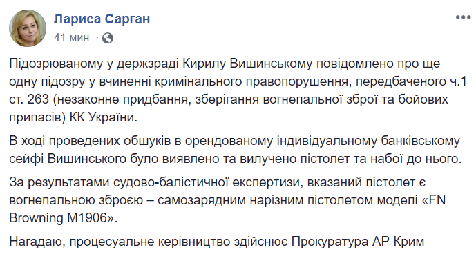 "Вышинскому сообщено о еще одном подозрении в совершении уголовного преступления, предусмотренного ч.1 ст. 263 (незаконное приобретение, хранение огнестрельного оружия и боеприпасов) УК Украины ", - сообщила она.