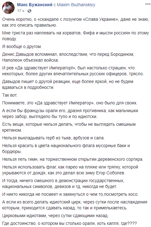Блогер Макс Бужанский пишет, что из патриотизма в Украине делают фарс: