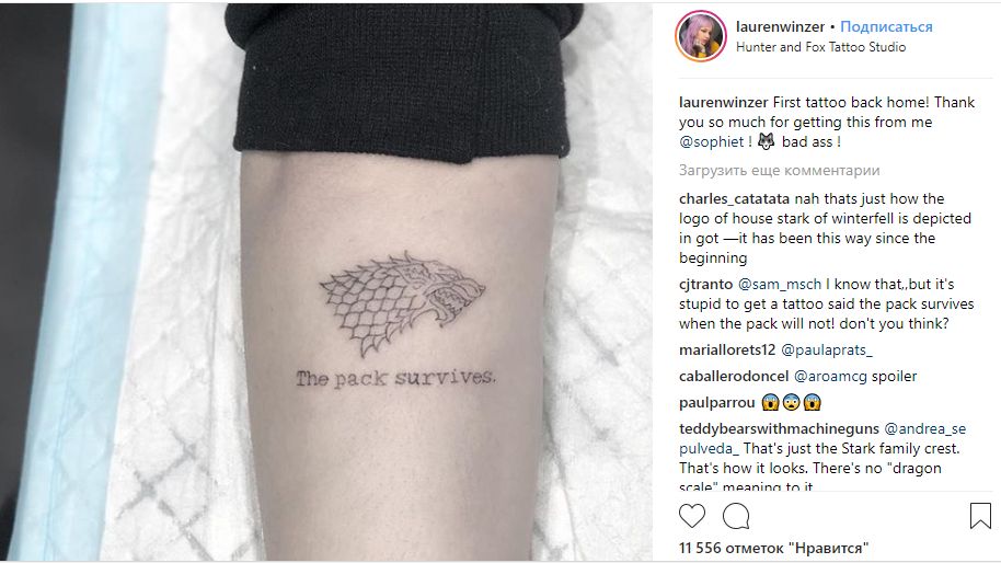 Не так давно общественность заинтриговала татуировка актрисы Софи Тернер, которая в "Игре престолов" играла Сансу Старк. Месяц назад у девушки на руке появилось изображение герба дома Старков – голова лютоволка – и надпись "Стая выживает". Фотографию опубликовал тату-мастер, отметив при этом Софи.