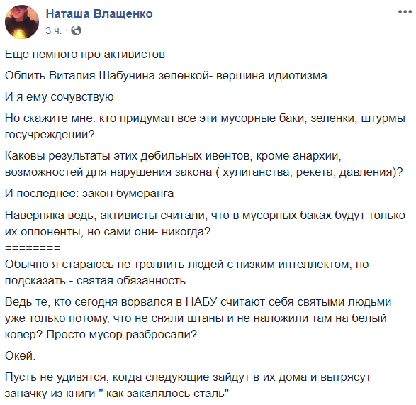 "Облить Виталия Шабунина зеленкой- вершина идиотизма. И я ему сочувствую.